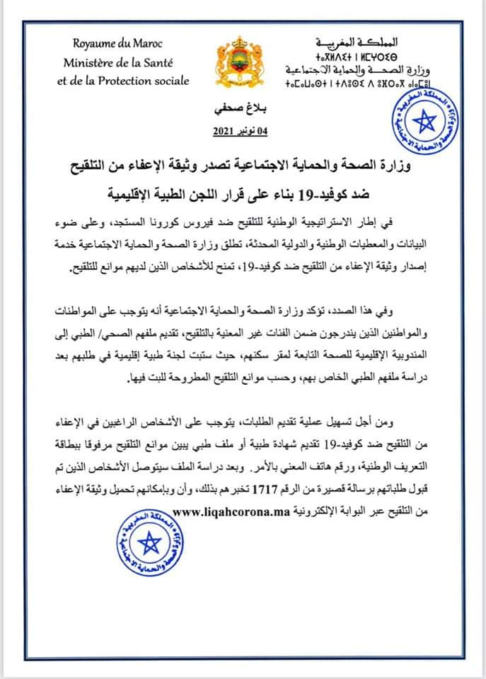 وأكدت الوزارة في بلاغها ، أنه يتوجب على المواطنات والمواطنين الذين يندرجون ضمن الفئات الغير معنية بالتلقيح، تقديم ملفهم الصحي والطبي إلى المندوبية الإقليمية للصحة التابعة لمقر سكناهم ، للبث والدراسة حسب موانع التلقيح المطروحة ، مرفوقا ببطاقة التعريف الوطنية ورقم هاتف المعني بالأمر ، وبعد دراسة الملف سيتوصل كل الأشخاص التي قبلت طلباتهم برسالة نصية من الرقم 1717 للإشعار بذلك ، وبإمكانهم تحميل وثيقة الإعفاء من التلقيح عبر البوابة الإلكترونية