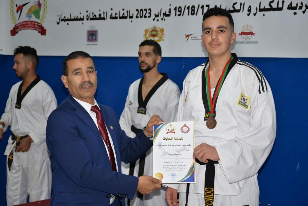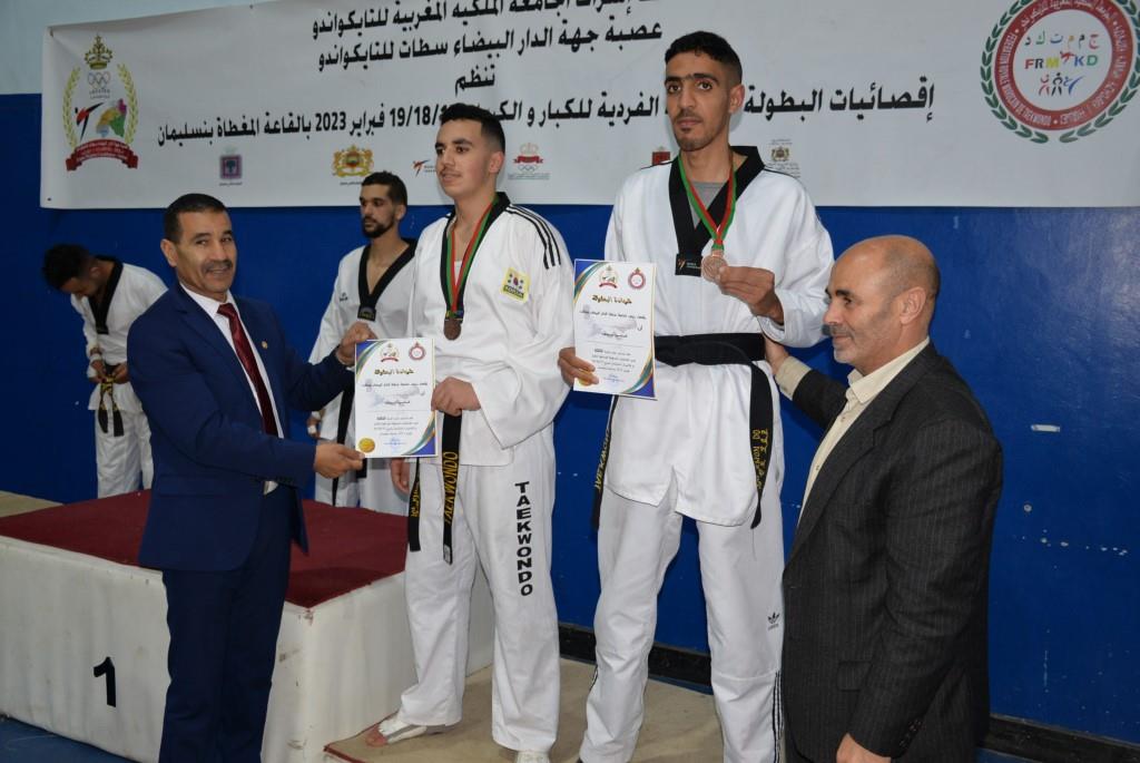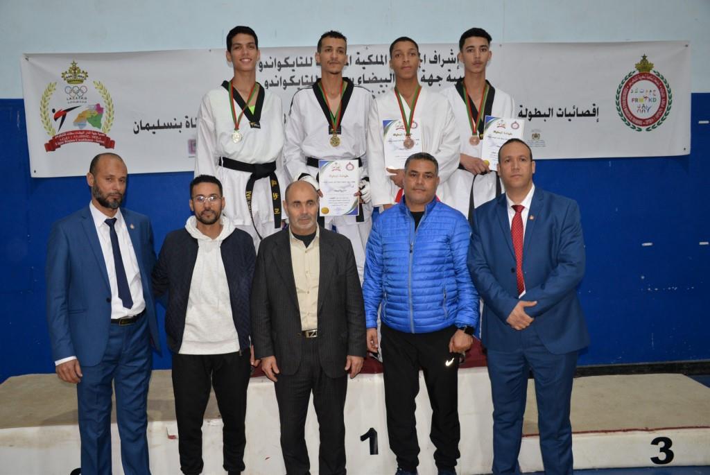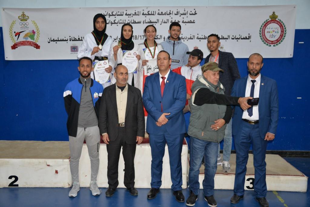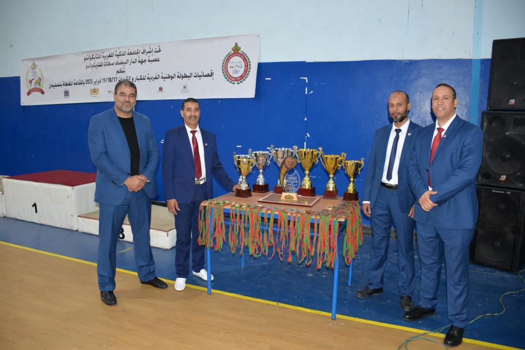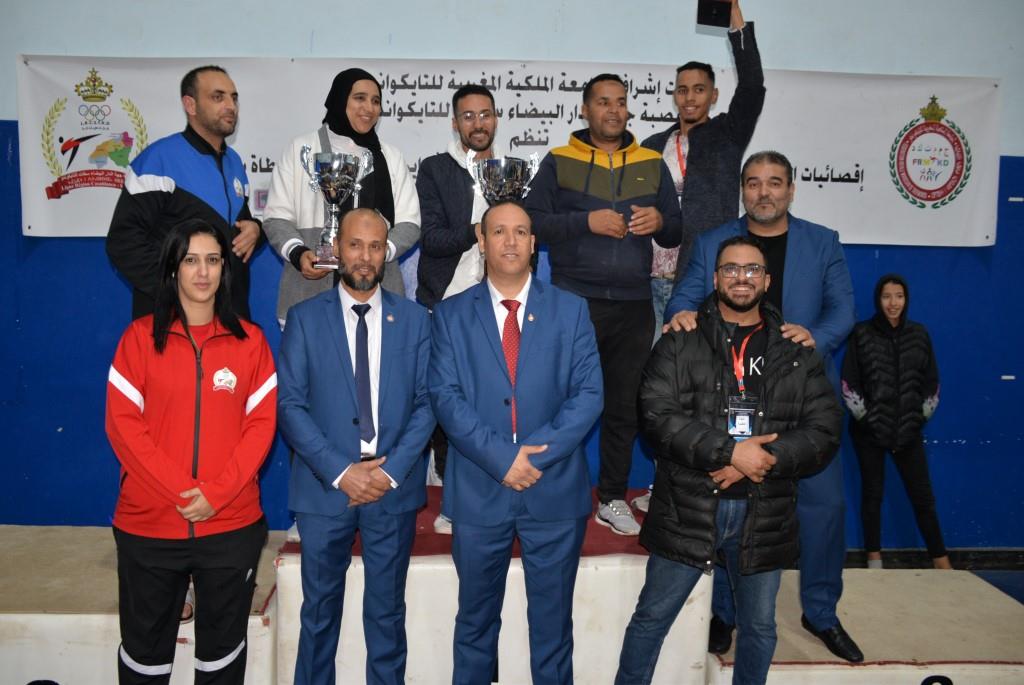 هؤلاء الأبطال إستطاعوا أن يفوزوا يومي 17-18 و19 فبراير 2023، بالقاعة المغطاة ببنسليمان، بالرتبة الأولى إناث فئة الكبيرات، والرتبة الثالثة ذكور فئة الكبار، وذلك برسم إقصائيات البطولة الوطنية الفردية كبار وكبيرات لسنة 2023، والتي أشرف على تنظيمها عصبة جهة الدار البيضاء سطات للتايكوندو، التابعة للجامعة الملكية المغربية للتايكوندو، بمشاركة حوالي 15 جمعية رياضية وأزيد من 140 مشارك ومشاركة بعصية جهة الدار البيضاء سطات، وبحضور كل من السيد رئيس عصبة جهة الدار البيضاء سطات للتايكوندو الاستاذ “الحبيب المهداوي”، والسيد “كمال شتوان” باشا مدينة بنسليمان، والسيد “مصطفى العمراوي” مدير الديوان، والسيد “إبراهيم ممدوح” والسيدة “أحلام المواق” ممثلي المجلس الجماعي لبنسليمان، وأعضاء المكتب المديري للعصبة، ورؤساء الجمعيات المشاركة، وعدة فعاليات رياضية محلية ووطنية، قاموا بتتويج مختلف البطلات والأبطال الفائزين بالميداليات والكؤوس.