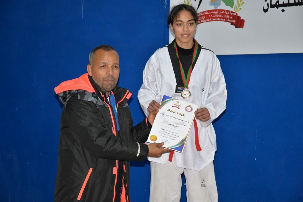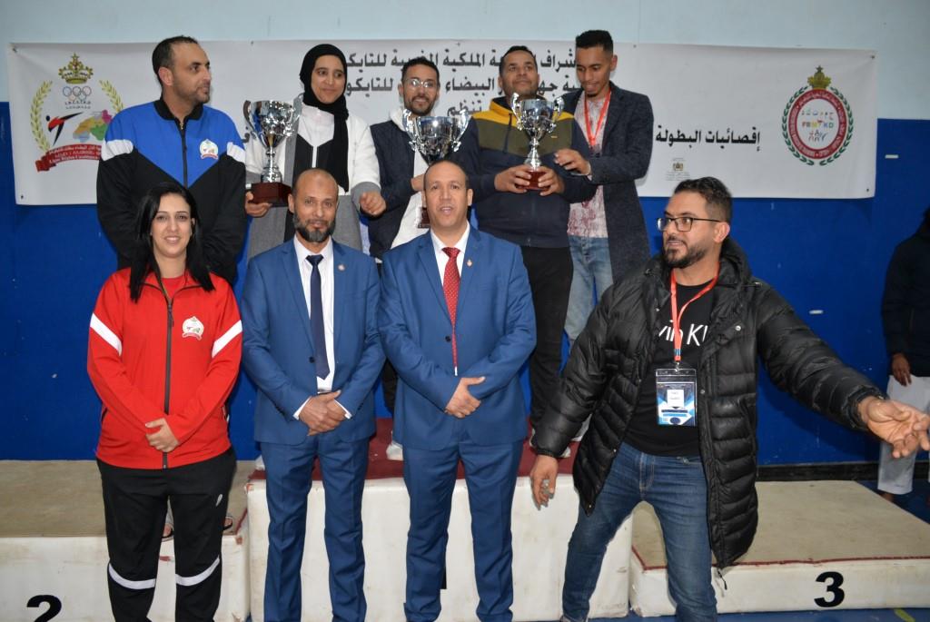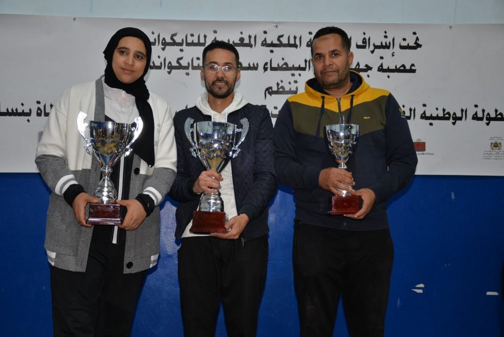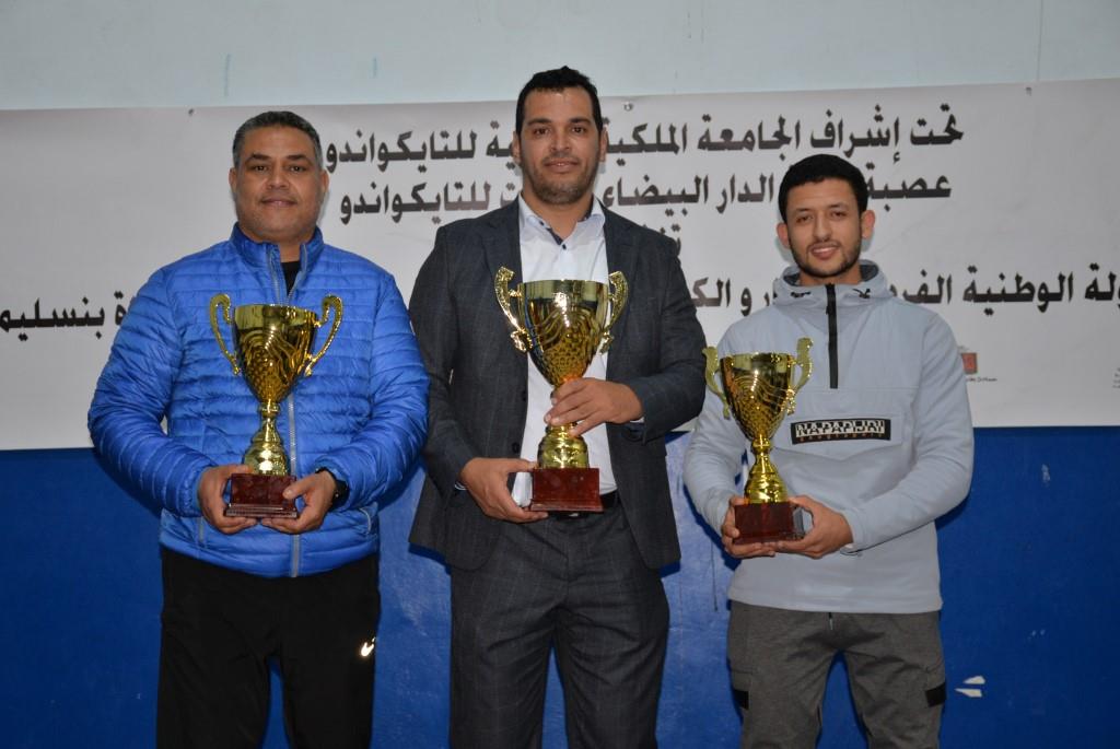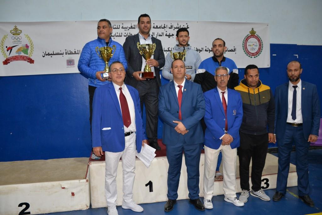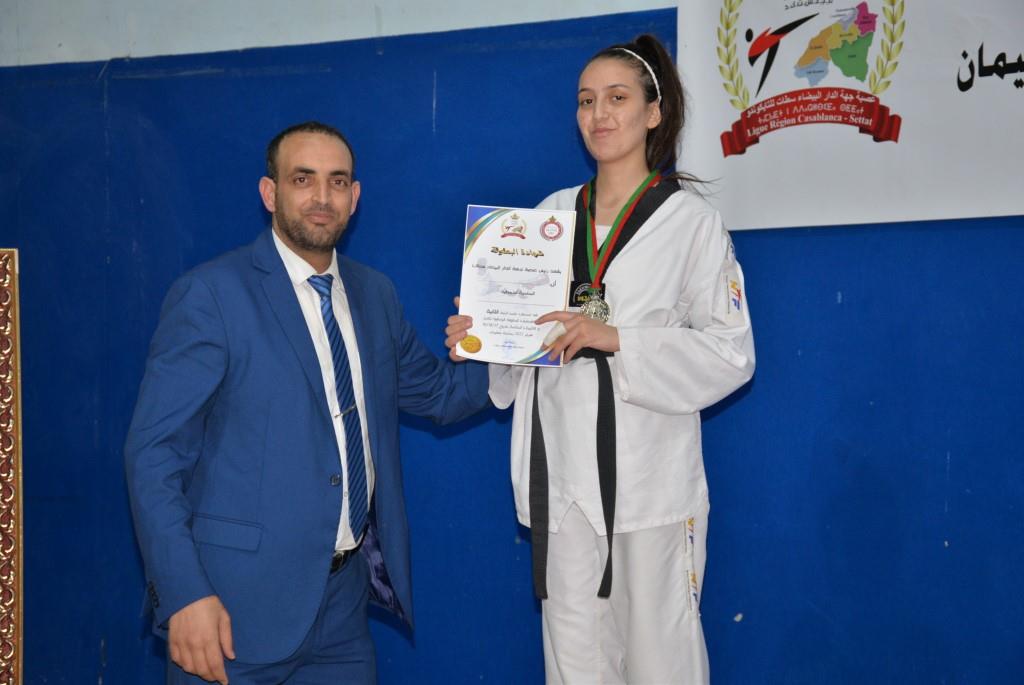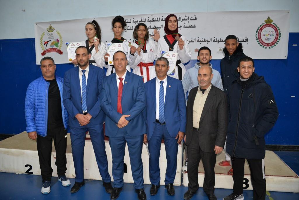 هؤلاء الأبطال إستطاعوا أن يفوزوا يومي 17-18 و19 فبراير 2023، بالقاعة المغطاة ببنسليمان، بالرتبة الأولى إناث فئة الكبيرات، والرتبة الثالثة ذكور فئة الكبار، وذلك برسم إقصائيات البطولة الوطنية الفردية كبار وكبيرات لسنة 2023، والتي أشرف على تنظيمها عصبة جهة الدار البيضاء سطات للتايكوندو، التابعة للجامعة الملكية المغربية للتايكوندو، بمشاركة حوالي 15 جمعية رياضية وأزيد من 140 مشارك ومشاركة بعصية جهة الدار البيضاء سطات، وبحضور كل من السيد رئيس عصبة جهة الدار البيضاء سطات للتايكوندو الاستاذ “الحبيب المهداوي”، والسيد “كمال شتوان” باشا مدينة بنسليمان، والسيد “مصطفى العمراوي” مدير الديوان، والسيد “إبراهيم ممدوح” والسيدة “أحلام المواق” ممثلي المجلس الجماعي لبنسليمان، وأعضاء المكتب المديري للعصبة، ورؤساء الجمعيات المشاركة، وعدة فعاليات رياضية محلية ووطنية، قاموا بتتويج مختلف البطلات والأبطال الفائزين بالميداليات والكؤوس.