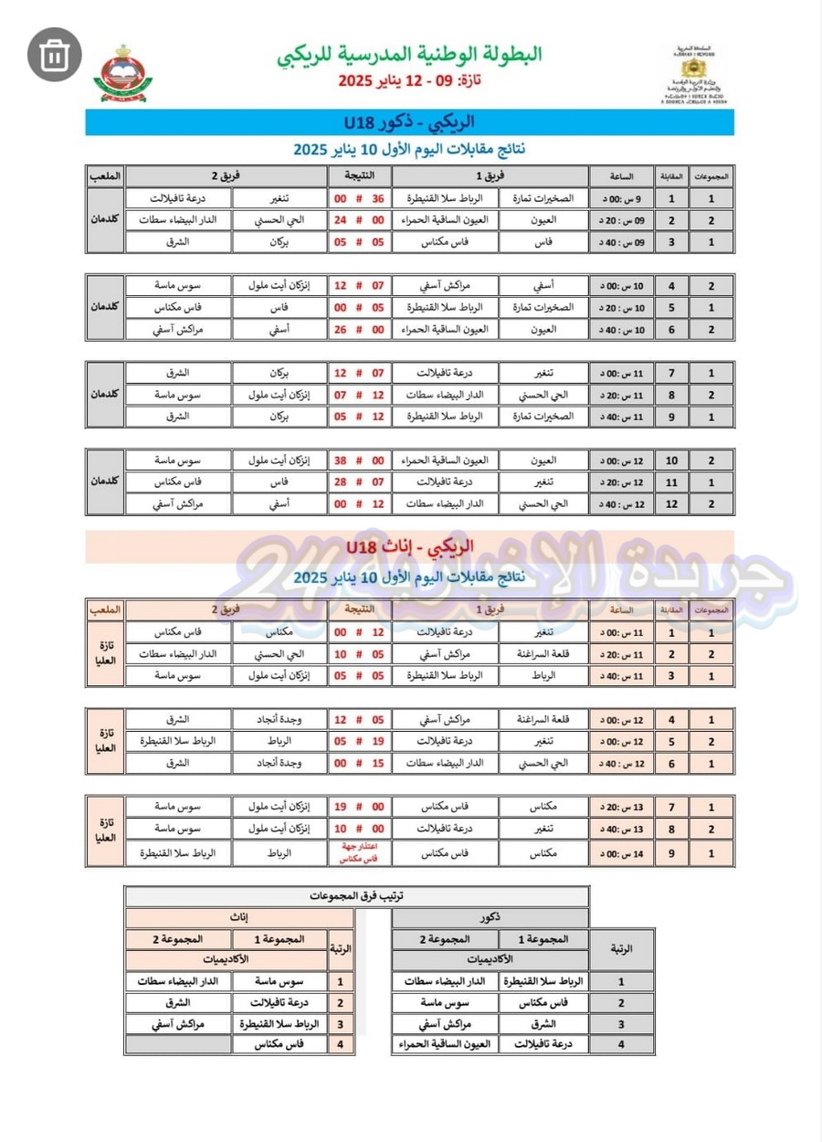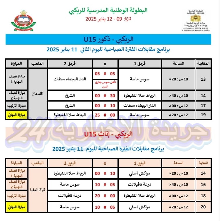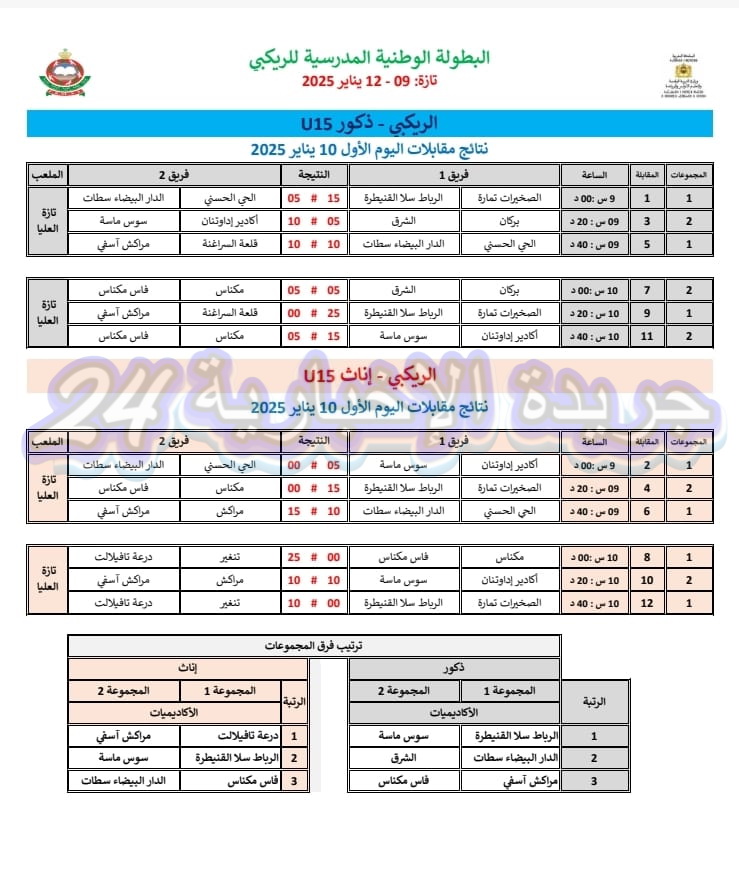 وعرفت منافسات البطولة الوطنية المدرسية للريكبي ، التي نظمتها وزارة التربية الوطنية والتعليم الأولي والرياضة، بشراكة مع الجامعة الملكية المغربية للرياضة المدرسية وبتنسيق مع الفرع الجهوي بأكاديمية جهة فاس-مكناس، بمدينة تازة خلال الفترة الممتدة من 09 إلى 12 يناير 2025 برسم الموسم الدراسي 2024-2025، مشاركة 280 تلميذة وتلميذا يمثلون جميع الأكاديميات الجهوية للتربية والتكوين، والذين تأهلوا عن البطولات الجهوية المدرسية وقبلها الإقليمية، حيث شكلت هذه التظاهرة الرياضية فرصة للمشاركين لإبراز مؤهلاتهم ومواهبهم في في رياضة الريكبي، وكذا انفتاحهم وتفاعلهم مع زميلاتهم وزملائهم، وتعد هذه الفعالية الرياضية المتميزة آلية مثلى لتكريس المساواة بين الجنسين، وتكافؤ الفرص وجعل الرياضة المدرسية في خدمة المتعلمين والمتعلمات ووسيلة للتلاقي والتنافس الشريف والتشبع بالقيم الرياضية، وفرصة لصقل مواهبهم ومهاراتهم و الإستفادة من النصائح المقدمة من طرف السادة الأساتذة، لكسب المزيد من التجارب الجديدة التي لامحالة سوف تغني رصيدهم الرياضي و الثقافي.