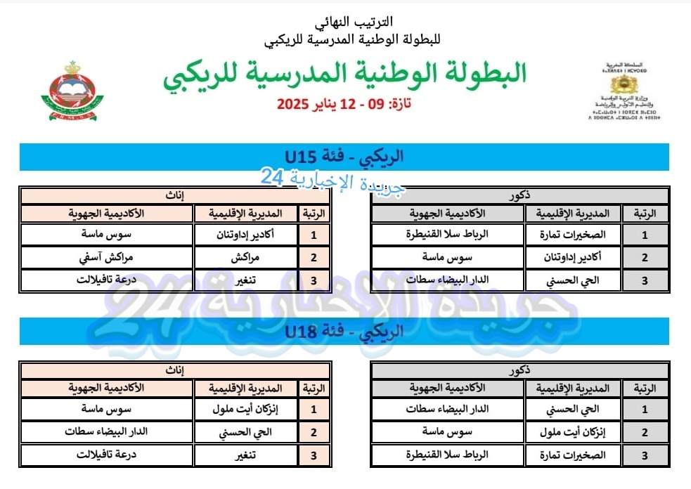 ولدى الإناث، أحرز فريق أكاديمية سوس ماسة، مديرية إنزكان أيت ملول المرتبة الأولى، متبوعا بأكاديمية الدار البيضاء سطات التي نالت المرتبة الثانية، فيما عادت المرتبة الثالثة لأكاديمية درعة تافيلالت.