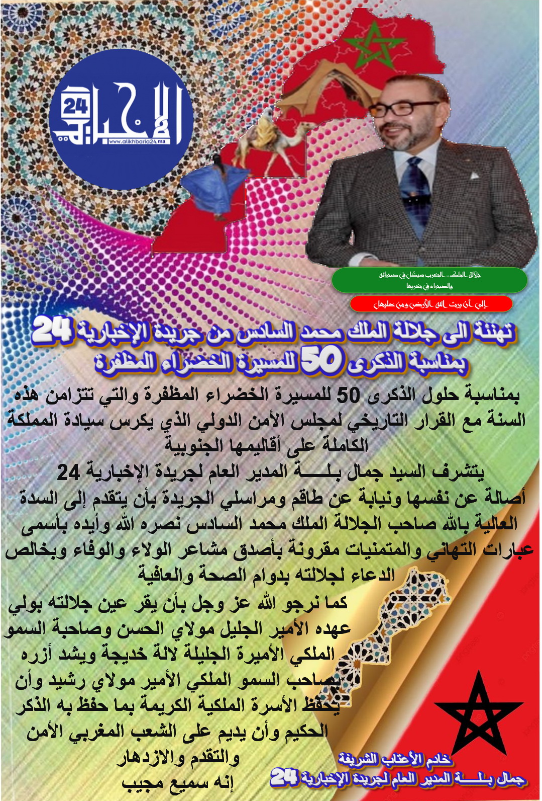 تهنئة الى جلالة الملك محمد السادس من جريدة الإخبارية 24 بمناسبة الذكرى 50 للمسيرة الخضراء المظفرة