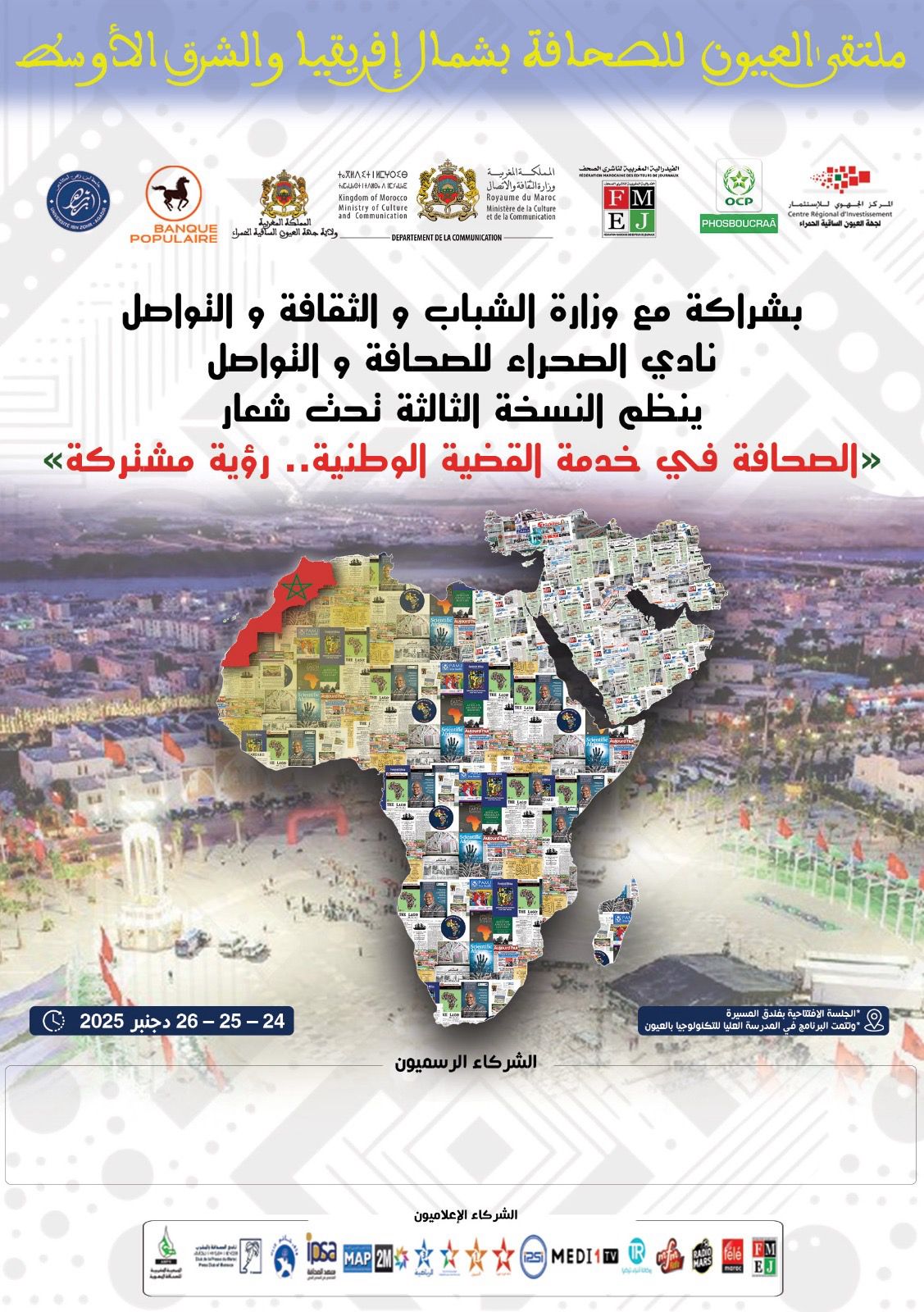 تحتضن مدينة العيون، خلال الفترة الممتدة من 24 إلى 27 ديسمبر الجاري، فعاليات الدورة الثالثة لملتقى إعلاميي شمال إفريقيا والشرق الأوسط، الذي ينظمه نادي الصحراء للصحافة والتواصل.تحت عنوان:«الصحافة في خدمة القضية الوطنية.. رؤية مشتركة» ويُنظم هذا الملتقى بدعم وشراكة مع وزارة الشباب والثقافة والتواصل – قطاع التواصل، وولاية جهة العيون الساقية الحمراء، وشركة فوسبوكراع، والمركز الجهوي للاستثمار بالعيون، والبنك الشعبي، وذلك في سياق وطني يتسم بتعزيز المكاسب الدبلوماسية والتنموية التي حققتها المملكة المغربية في ملف الصحراء.