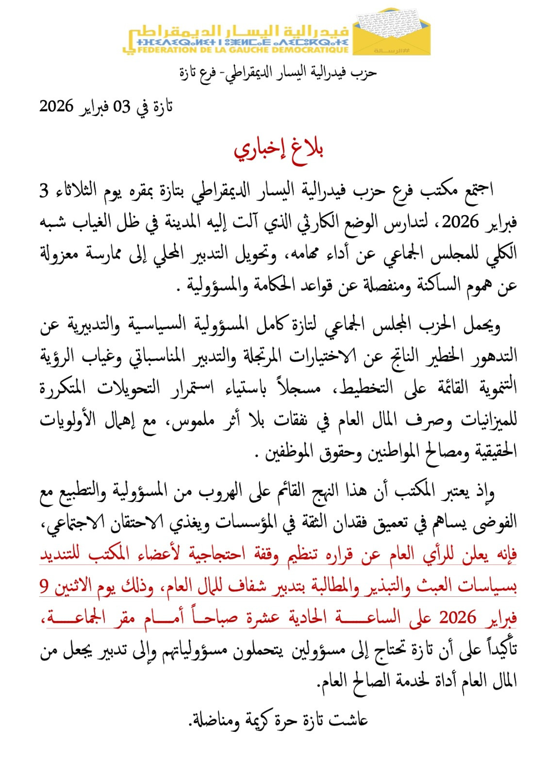 وإذ يعتبر المكتب أن هذا النهج القائم على الهروب من المسؤولية والتطبيع مع الفوضى يساهم في تعميق فقدان الثقة في المؤسسات ويغذي الاحتقان الاجتماعي، *فإنه يعلن للرأي العام عن قراره تنظيم وقفة احتجاجية لأعضاء المكتب للتنديد بسياسات العبث والتبذير والمطالبة بتدبير شفاف للمال العام، وذلك يوم الاثنين 9 فبراير 2026 على الساعة الحادية عشرة صباحاً أمام مقر الجماعة*، تأكيداً على أن تازة تحتاج إلى مسؤولين يتحملون مسؤولياتهم وإلى تدبير يجعل من المال العام أداة لخدمة الصالح العام.