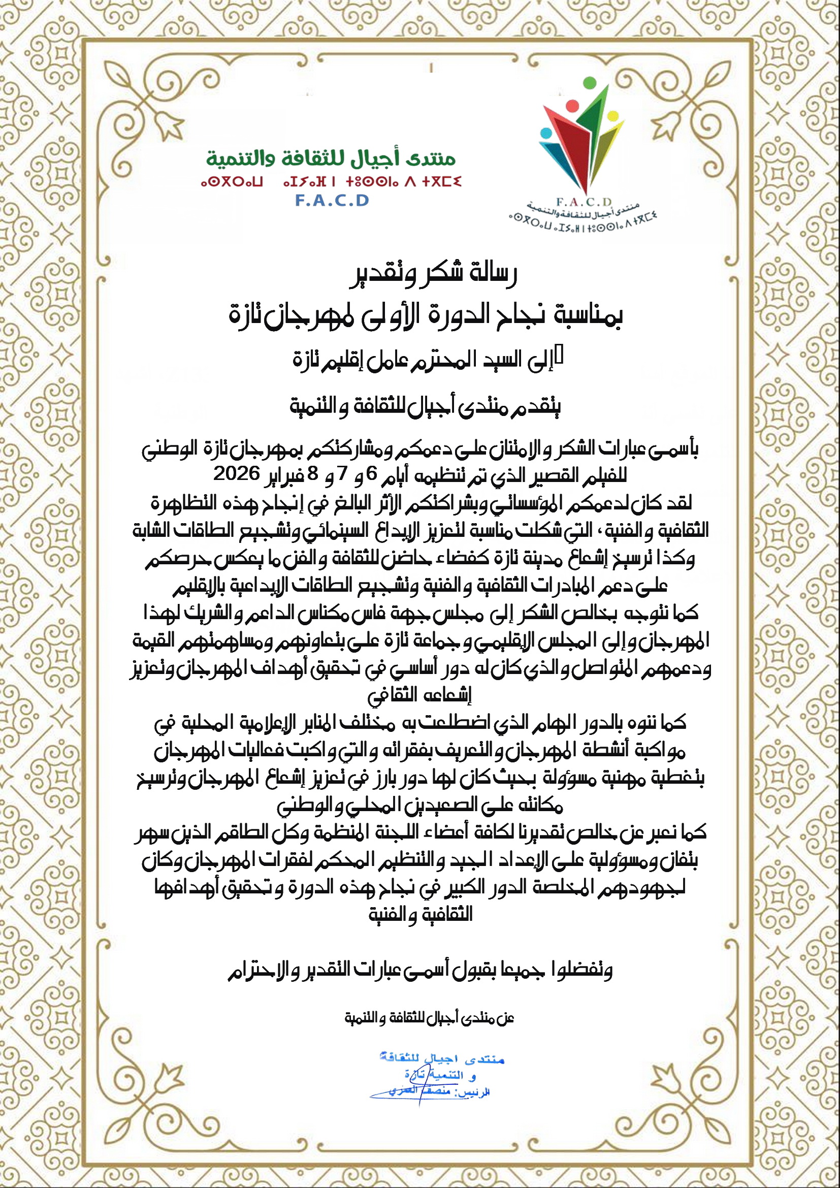 وأكد منتدى أجيال للثقافة والتنمية، في رسالة شكر وتقدير رسمية أصدرها رئيسه السيد منصف العمري، أن هذا الحدث الثقافي الواعد لم يكن ليحقق هذا الإشعاع لولا جهود الجميع، بدء من السيد رشيد بنشيخي عامل الإقليم، مجلس جهة فاس – مكناس، والمجلس الإقليمي لتازة، وجماعة تازة، المنظمين والمنار الإعلامية الذين قدموا أعمالا إبداعية استثنائية، بالإضافة إلى عشرات المتطوعين الذين بذلوا جهودا جبارة.