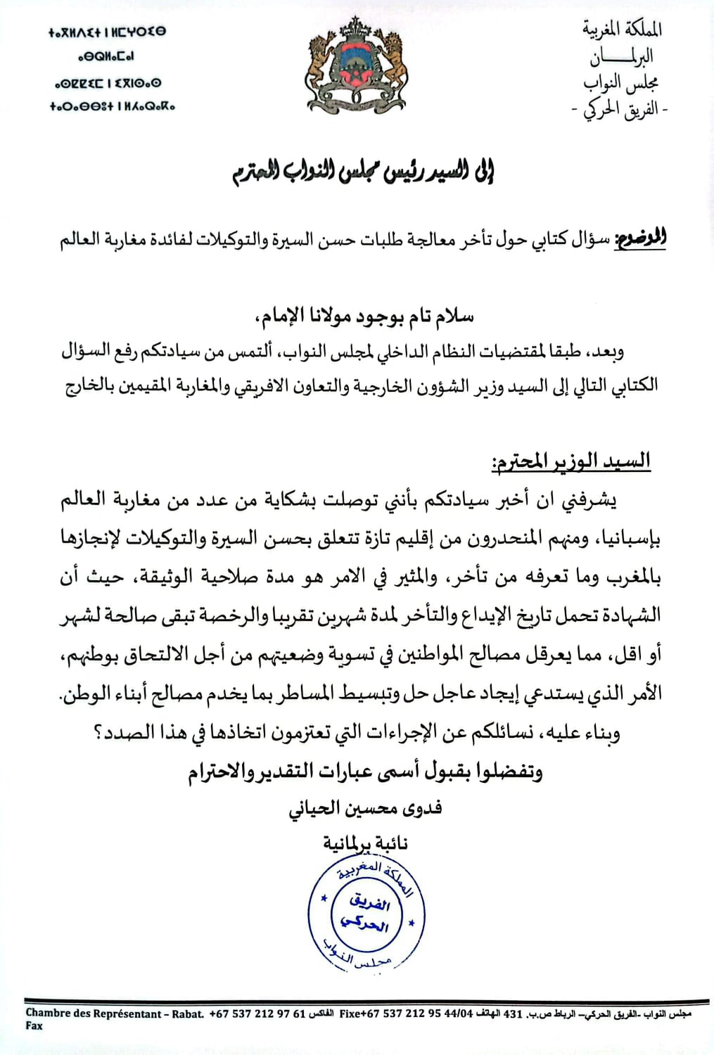 وجهت فدوى محسن الحياني النائبة البرلمانية عن الفريق الحركي سؤالا كتابيا إلى السيد رئيس مجلس النواب، قصد إحالته على وزير الشؤون الخارجية والتعاون الإفريقي والمغاربة المقيمين بالخارج، وذلك بخصوص ما وصفته بتأخر معالجة طلبات حسن السيرة والتوكيلات لفائدة أفراد الجالية المغربية بالخارج، خاصة المقيمين بإسبانيا، في خطوة تعكس انشغالات مغاربة العالم بقضاياهم الإدارية.