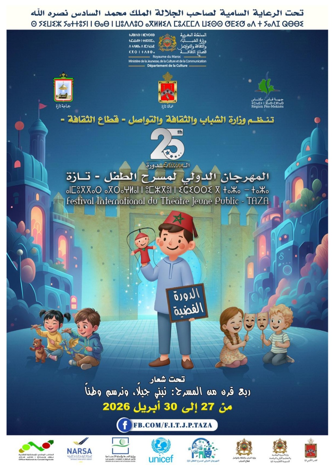 تستعد مدينة تازة لاحتضان الدورة الخامسة والعشرين للمهرجان الدولي لمسرح الطفل، وذلك خلال الفترة الممتدة من 27 إلى 30 أبريل 2026، في تظاهرة فنية وثقافية تقام تحت الرعاية السامية لصاحب الجلالة محمد السادس، في تأكيد جديد على العناية التي يوليها المغرب للثقافة والفنون الموجهة للطفل، باعتبارها رافعة أساسية للتنشئة والإبداع.