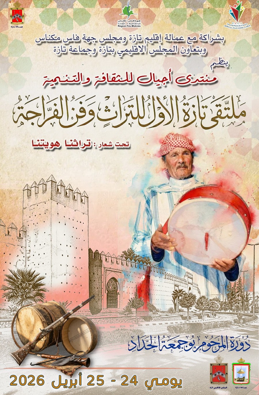 تازة تحتفي بتراثها اللامادي وموروثها الثقافي من خلال تنظيم ملتقى تازة الأول للتراث وفن الفرجة، الذي سيقام تحت شعار “تراثنا هويتنا” دورة المرحوم بوجمعة الحداد، يومي 24 و25 أبريل 2026، في مبادرة ثقافية تروم إبراز غنى وتنوع الهوية التازية وتعزيز حضورها في المشهد الثقافي الوطني.